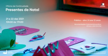 PRESENTES DE NATAL Oficina de continuidade 21 e 22 dez 2021 10h00 às 17h00 Público –alvo | 8-12 anos Ingresso | 6 euros Recomendações | trazer almoço, 2 lanches (...)