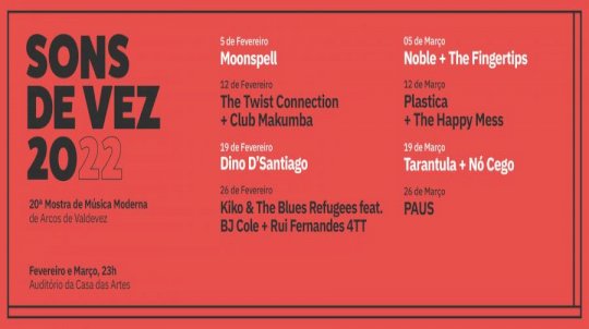 Moonspell, Dino D’Santiago, PAUS, Club Makumba e Tarantula são alguns dos artistas que irão celebrar os 20 anos do Festival Sons de Vez, naquela que é uma das mais antigas mostras de música portuguesa do país. Esta edição comemorativa e verdadeiramente histórica, que decorre todos os sábados de 5 de Fevereiro a 26 de Março, coloca no palco da Casa das Artes em Arcos de Valdevez, nomes consagrados e emergentes numa festa que assinala o regresso aos palcos depois de duas edições interrompidas pela pandemia.